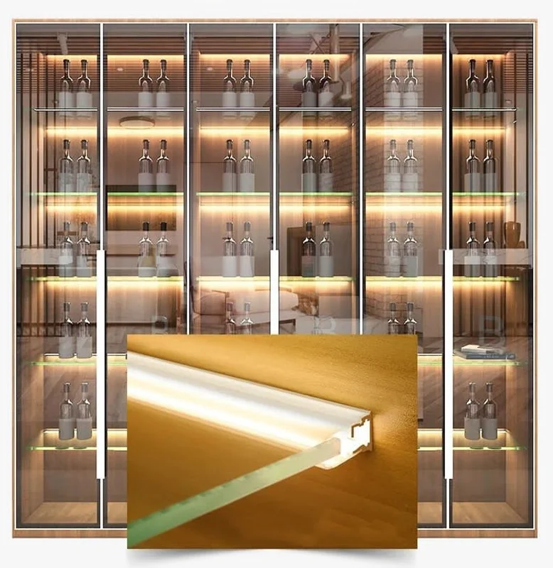 یکی دیگر از کاربردهای شلفهای نورانی، نورپردازی طبقات داخل بوفه است، که باعث جلوه بسیار زیبایی در داخل بوفه و دکوراسیون میشود.به این صورت که پروفیل در انتهای بوفه شما قرار میگیرد و شیشهها داخل پروفیل قرار گرفته و نور ال ای دی باعث روشن شدن شیشه میشود. همچنین میتوانید با استفاده از سنسورهای مخصوص روشنایی داخل طبقات بوفه را کنترل کنید.